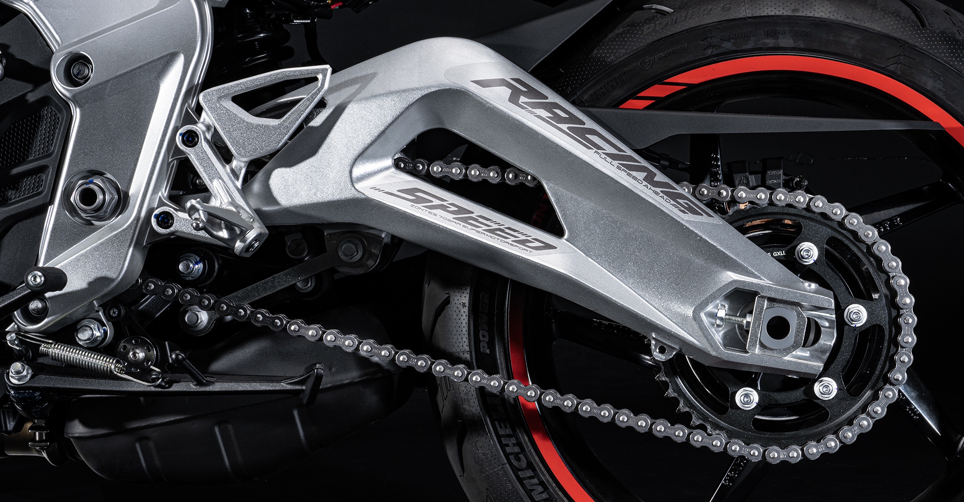 Le bras oscillant monobloc ajouré et les jantes en aluminium renforcent la réactivité et la tenue de route